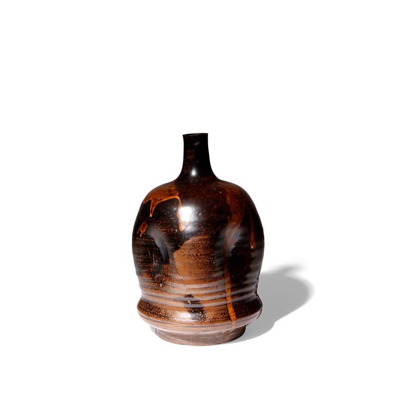 The cylindrical body raised on a short foot and with a slender neck, the sides with four indentations and decorated with tenmoku-style russet-coloured drips on the mottled chocolate-brown ground, 23cm.