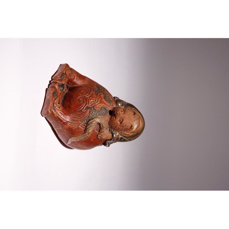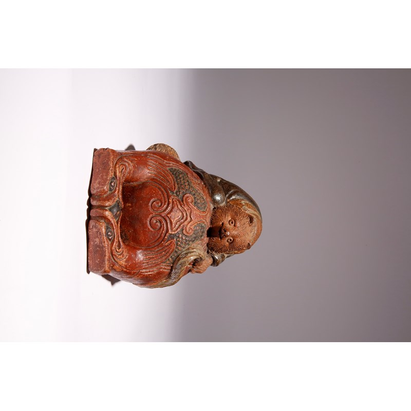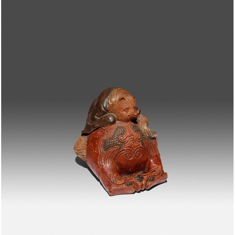 A JAPANESE SHIGARAKI OKIMONO OF A TANUKI ON A MOKUGYO