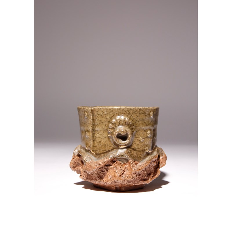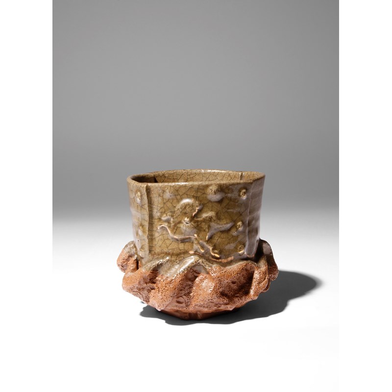 Of cylindrical form, the lower half an earthy brown colour and moulded with organic shapes, the upper half