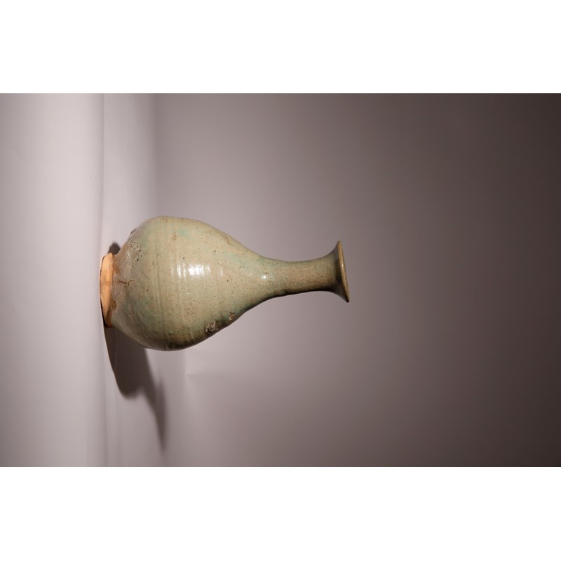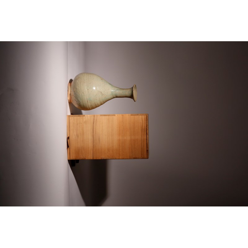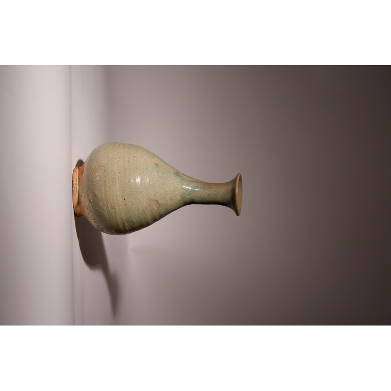 The uneven pear-shaped body raised on a short foot, the surface covered with a blue-grey glaze with crackled areas and speckled with russet dots, the foot left unglazed, with a wood box inscribed 'Aomori Collection', probably for the Aomori City Collection, 33cm. (2)