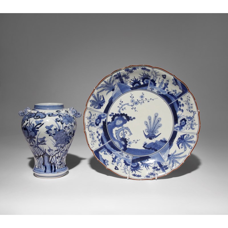 Painted in underglaze blue with a central cartouche enclosing an elegant ho-o bird, the shochikubai (pine, prunus and bamboo) emerging from rockwork beside it; the cavetto with panels variously enclosing Chinese figures, flowering branches and further peacocks, the underside with karakusa scrolls, the base left unglazed; together with a baluster-shaped vase decorated in underglaze blue with peonies and pomegranates amongst tall grasses, the shoulder applied with small studs and handles modelled as mythical creatures with lion heads and fish tails, 34cm and 21.7cm respectively. (2)
