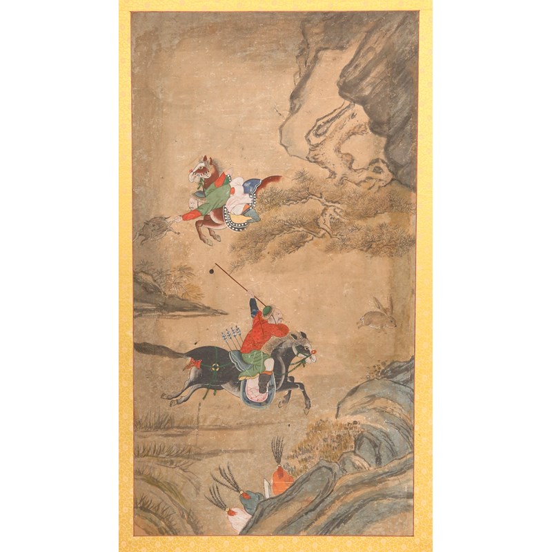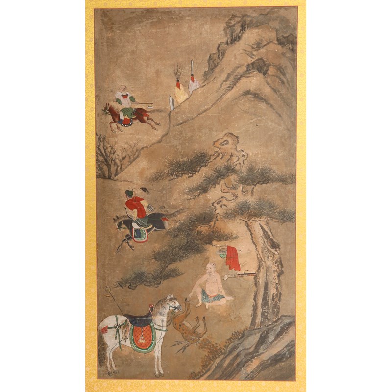 Cf. V Reynolds, Korean Folk Painting in the Newark Museum, Korean Art - Articles from Orientations 1970-2013, pp.180-81 where a similar Folk art hunting screen is discussed.