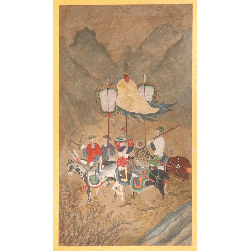 Each panel painted in ink and colour on paper with horse riders hunting various quarries including deer, tiger, leopards and hares; one huntsman with two falcons, another holding a matchlock carbine, many others with woldo (halberds); the figures wearing colourful garments contrasting with the buff landscape; the painted panels mounted on yellow silk, each 72cm x 38.5cm, 176cm x 275cm overall.