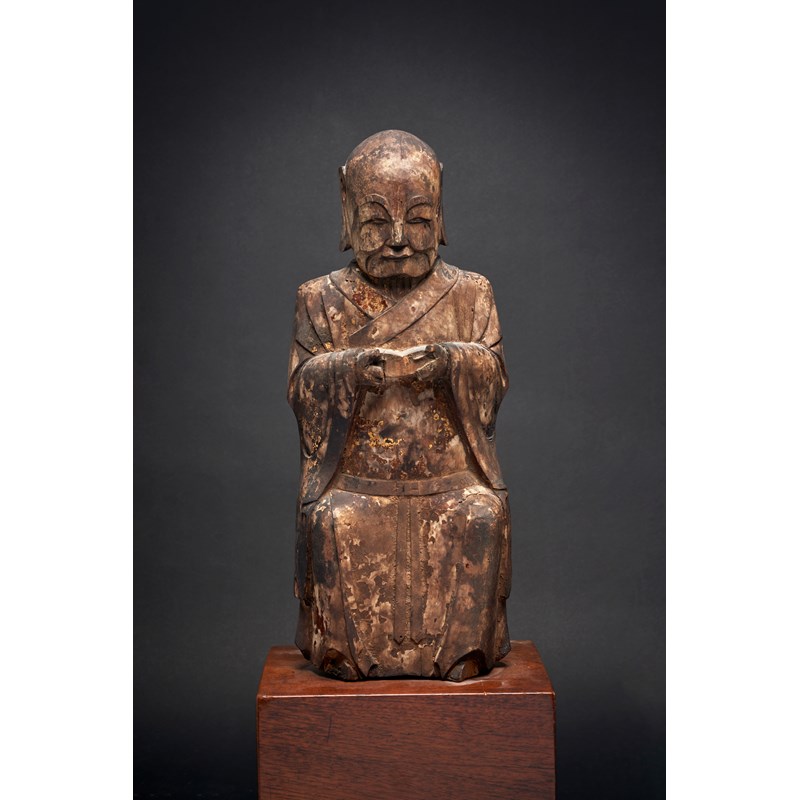Possibly Korean, carved seated with his hand held before his chest, dressed in long flowing robes, with a tranquil expression upon his face, with a fitted wooden base, 47cm. (2)