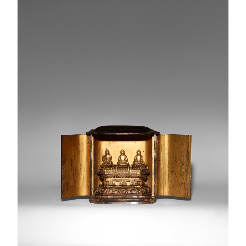 The case lacquered black, the doors opening to reveal the Amida Triad comprising of Amida Buddha, Kannon Bosatsu and possibly Seishi Bosatsu, the figures seated on double lotus thrones raised on a tall base decorated with scrolling clouds, reishi heads, flowers and geometric patterns, the whole interior gilded, with two illegible lines of inscriptions to the base, 24.3cm x 11cm x 23.5cm.