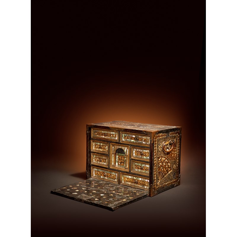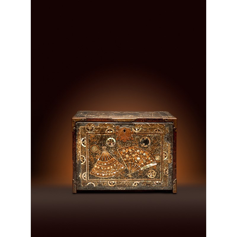 See the Brooklyn Museum, New York, access. no.84.69.1, for a comparable piece decorated with open fans. Also, see Christie's, New York, An Inquiring Mind: American Collecting of Japanese and Korean Art, lot 33, for another namban cabinet with mother of pearl fans.