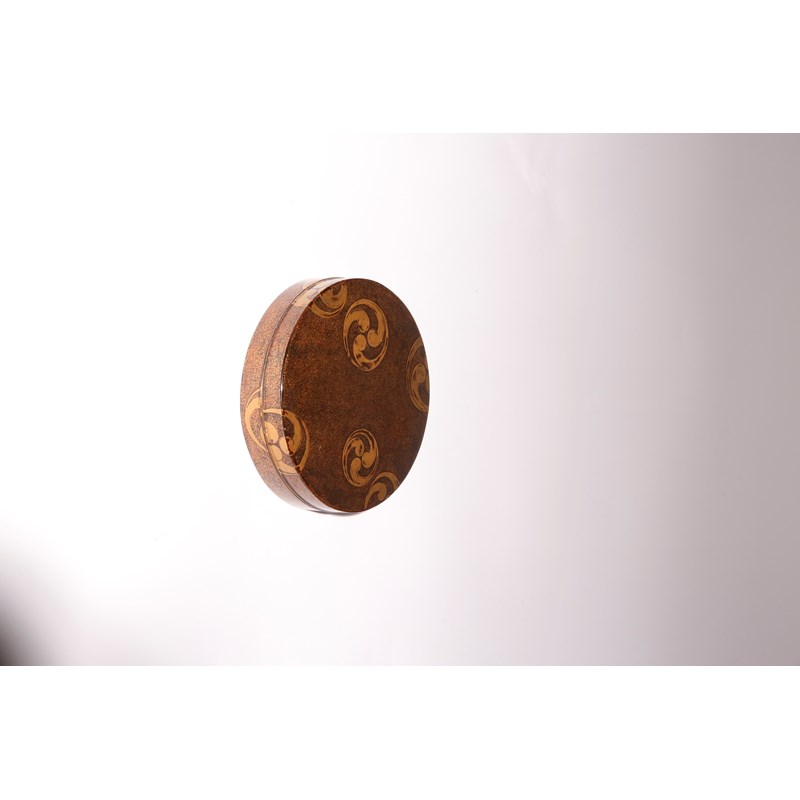 Of circular form, decorated with mitsu-tomoe (comma-like swirls) in gold fundame hiramaki-e lacquer on the roiro-nashiji ground, 12.3cm. (2)