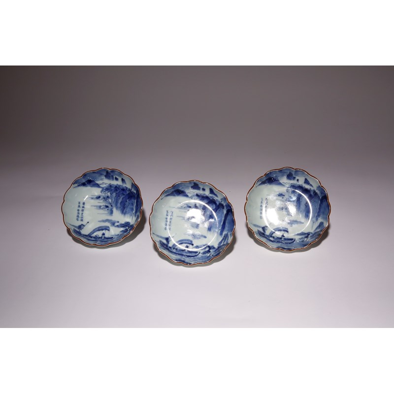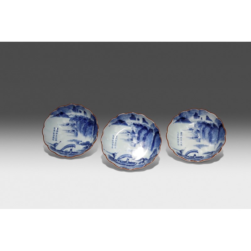 All three with a scalloped rim and brown-painted edge, each decorated in underglaze blue with figures in a mountainous river landscape, with calligraphy to the side referring to the Chinese poem 'Ode to the Red Cliff' by Su shi (1037-1101), the undersides left undecorated, 15.3cm each. (3)