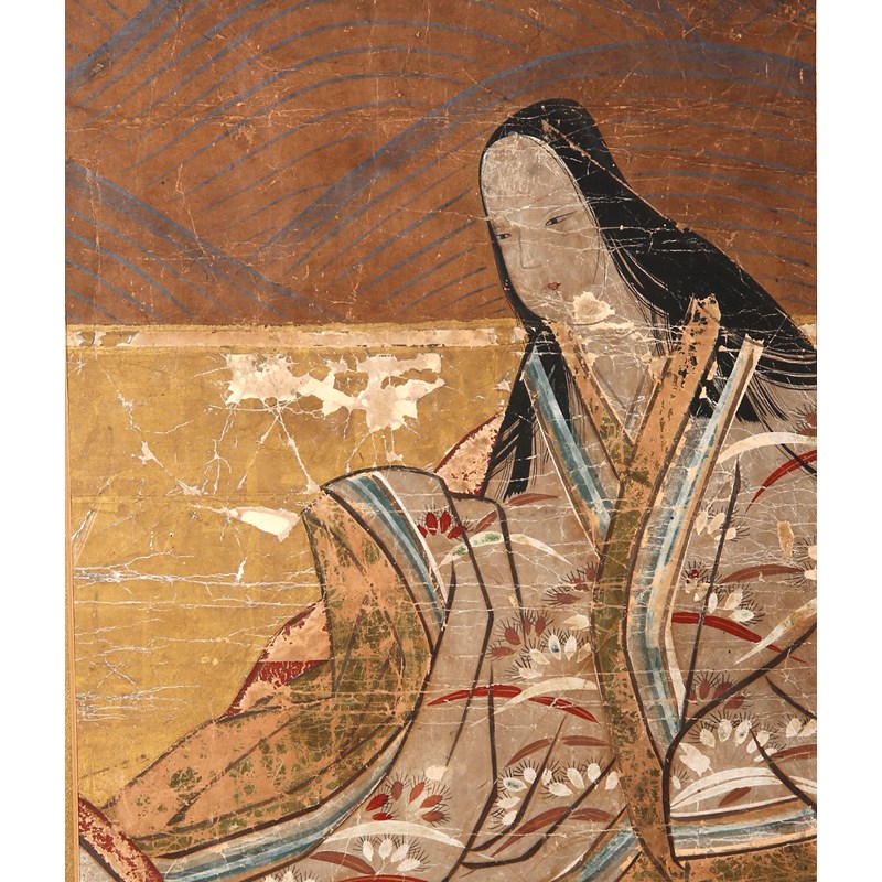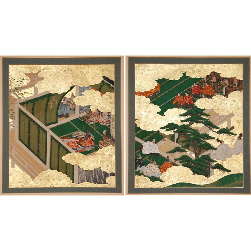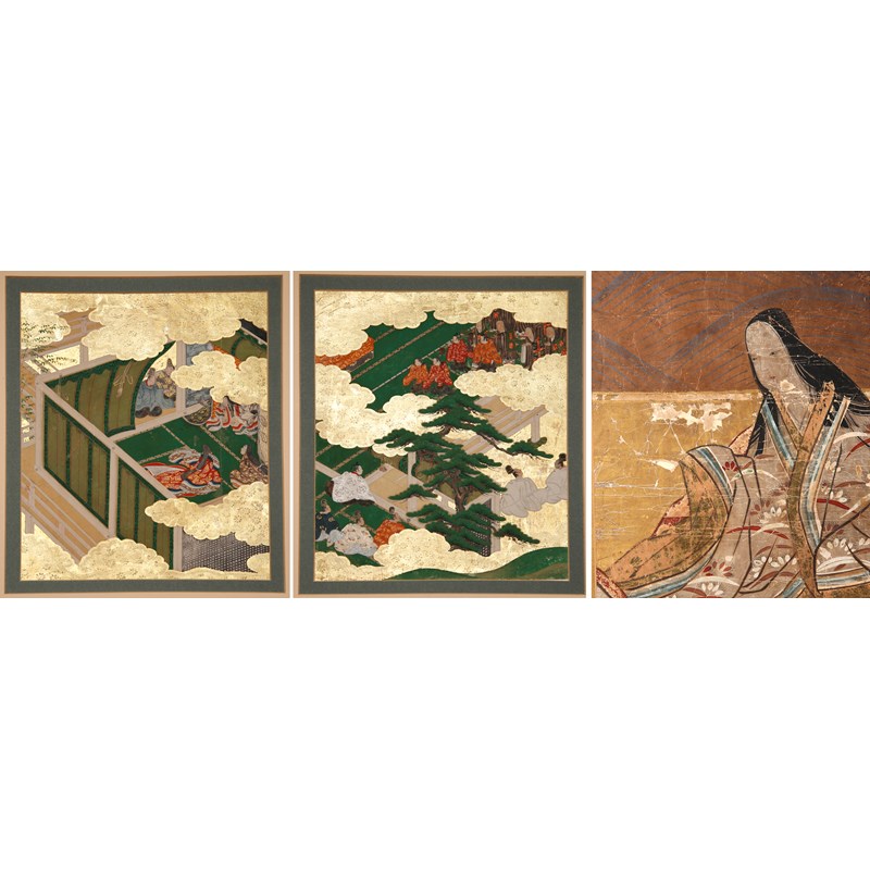 Two Japanese album leaves depicting scenes from the Genji Monogatari (The Tale of Genji), in ink, colour and gold on paper, one depicting chapter 39, scene 7 ('Evening Mist'), the other with a group of monks, possibly for the funeral of Genji's wife Aoi, both framed and glazed, both approx. 29.5cm x 24.3cm; together with a portrait of a woman wearing Heian garments, possibly the poetess Murasaki Shikibu (c.973-1031), mounted on board and framed, 27.5cm x 23cm. (3)
