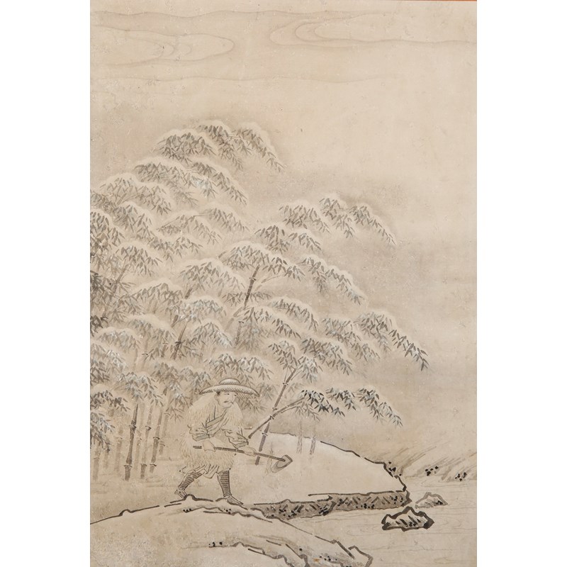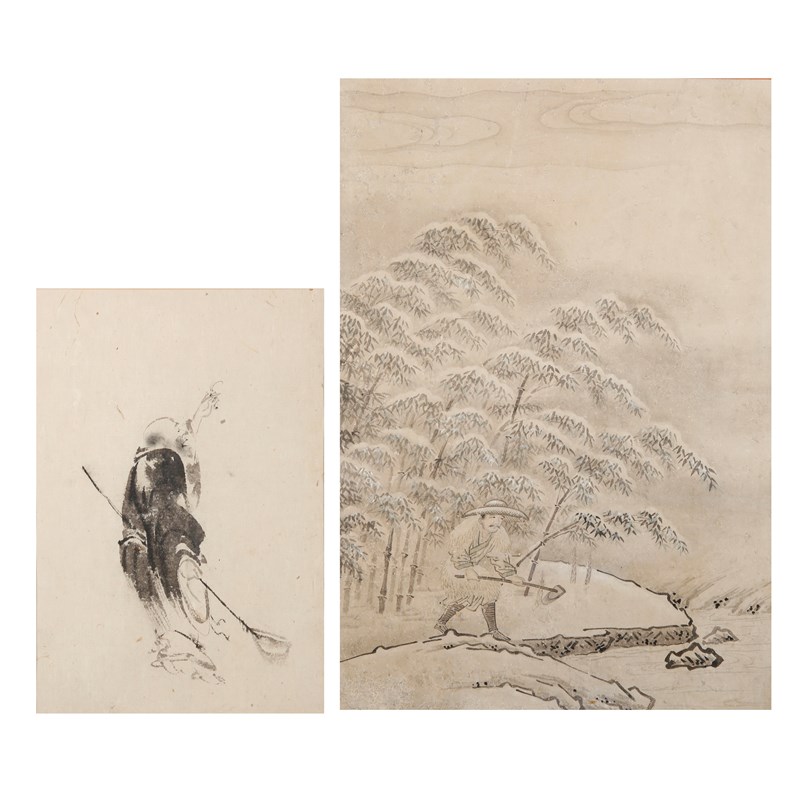 The larger painting may be a depiction of Moso, one of the Twenty-Four Paragons of Filial Piety often represented digging for bamboo shoots to feed his sick mother.