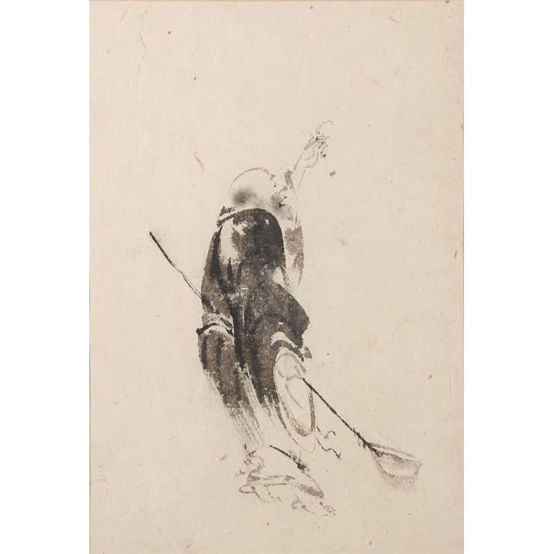 A Japanese painting in ink and colour on paper depicting a farmer in a bamboo grove, the man using an adze to dig out bamboo shoots while snow falls around him, together with an ink painting of a monk holding a broom, possibly Jittoku, both framed and glazed, 50cm x 35cm max. (2)