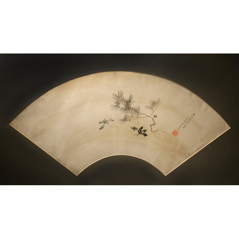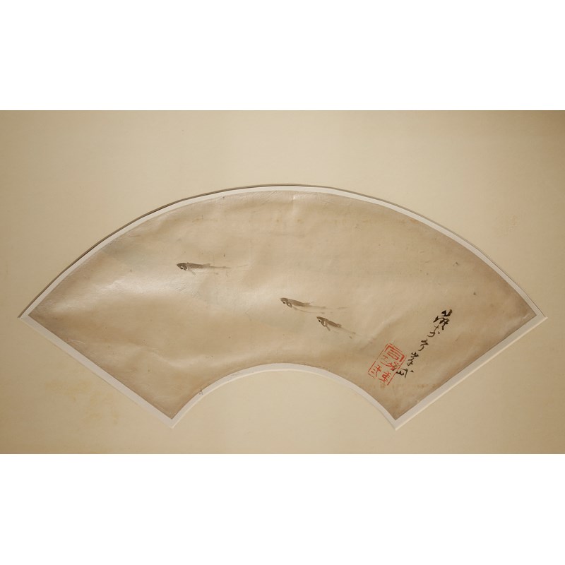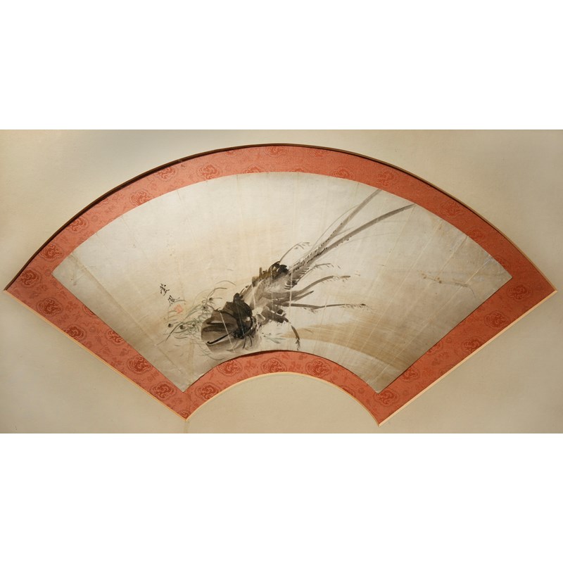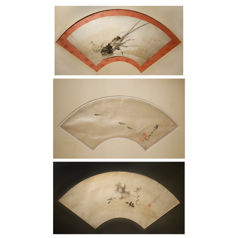 Three Japanese fan paintings, in ink and colour on paper, the first with a sprig of pine, dated the second year of Meiji (1869), signed Kansai and with a red seal mark; the second by Roho and depicting a spiny lobster amongst seaweed, signed and with a red seal mark, both framed and glazed; the third with three ayu fish by Gantai, signed and with a red seal mark, mounted on board, 19.5cm x 51cm max. (3)