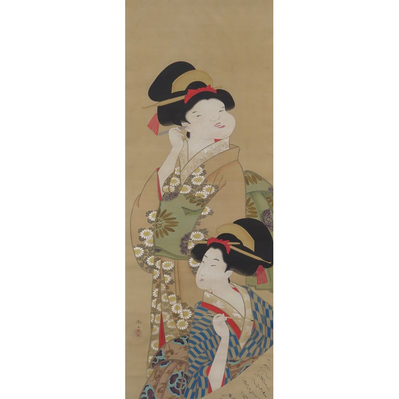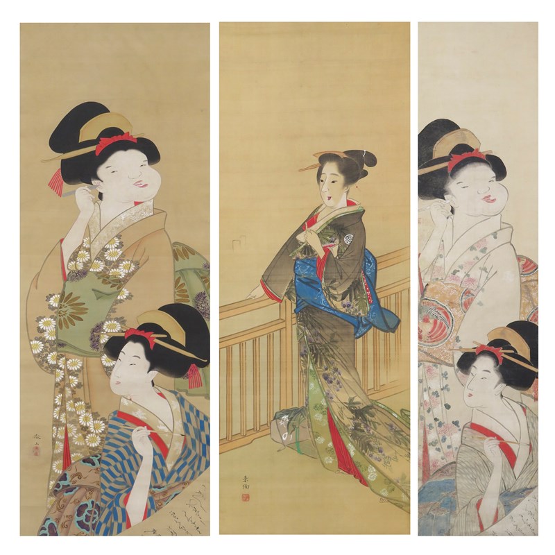Three Japanese scroll paintings of bijin, the first with a beauty standing by a balustrade, gazing at sailing boats in the distance, signed and with a red seal mark; the two others with similar compositions, depicting a beauty writing a letter and with Okame behind her, all three paintings with a tomobako wood box, 111cm x 42.5cm. (6)