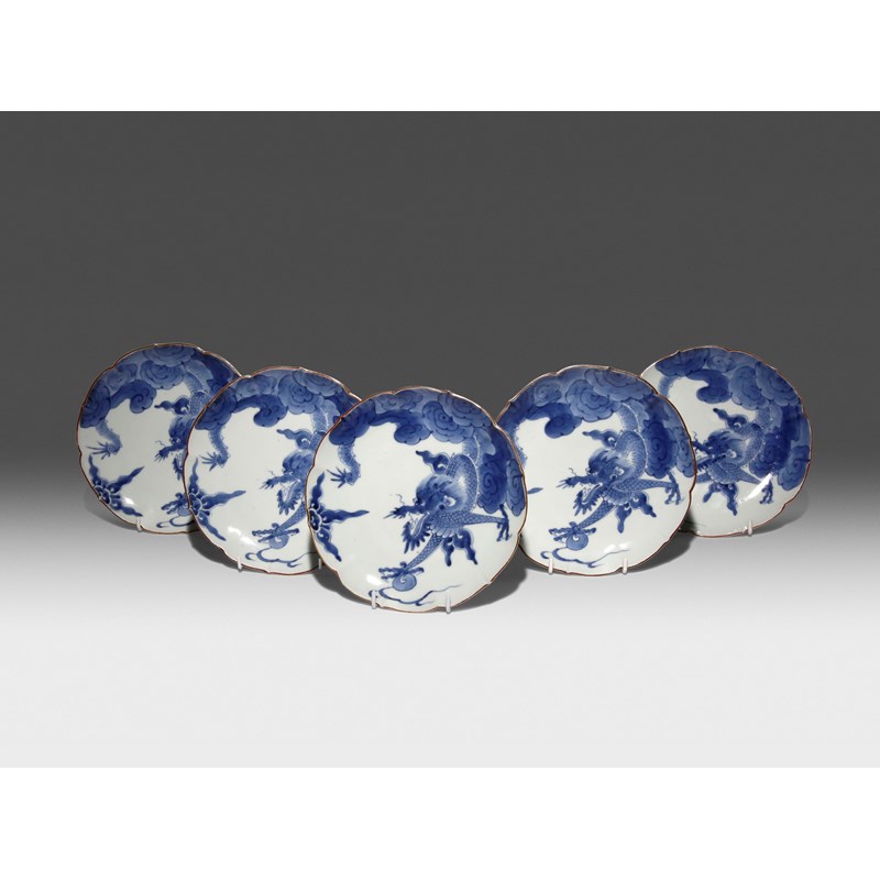 FIVE JAPANESE ARITA BLUE AND WHITE DISHES