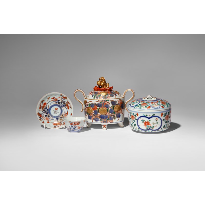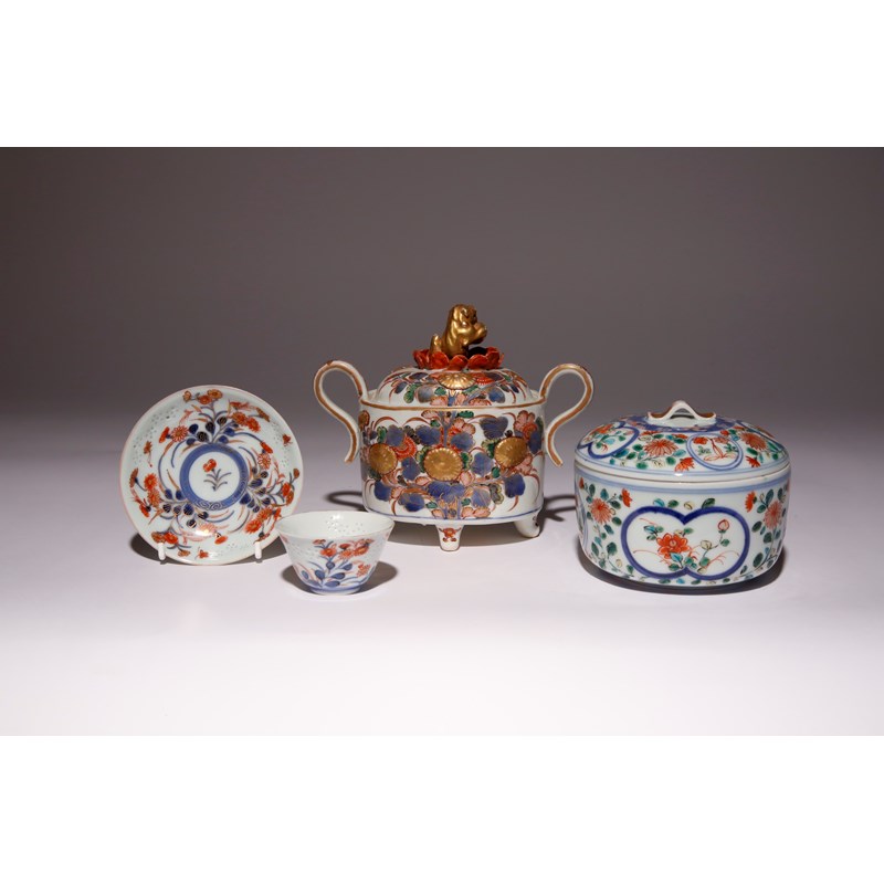 The first a double-handled koro, the incense burner raised on four short legs and with a dense decoration of chrysanthemum flowers amongst leafy tendrils, painted in underglaze blue, gilt, red and green enamels and with moulded details, the lid topped with a lion dog on a large flowerhead holding a brocade ball; another piece a box and cover painted with fan-shaped and circular medallions containing many flowers; and a small Imari cup and saucer, the surface with unusual translucent dots forming patterns evoking insects, painted with further blossoms and butterflies, 17.7cm max. (6)