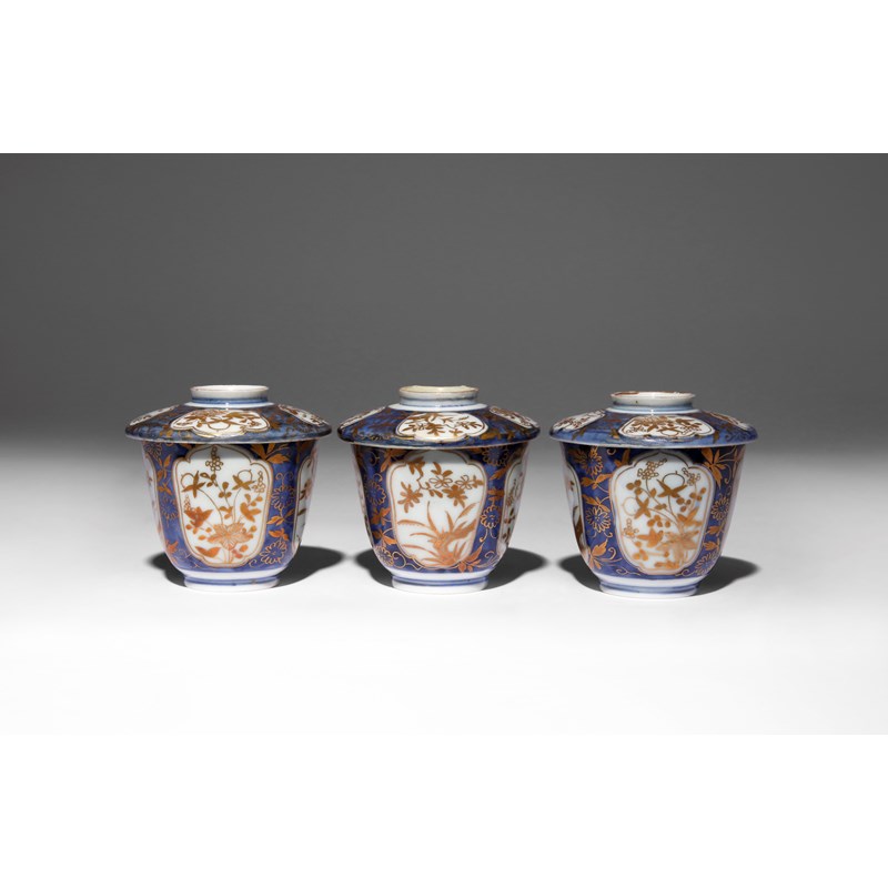 All decorated with panels enclosing elegant depictions of flowers, fruiting branches and other plants, all reserved on a cobalt blue ground embellished with further flowers and scrolling tendrils, the rich decoration rendered in gilt, 8.6cm max. (6)