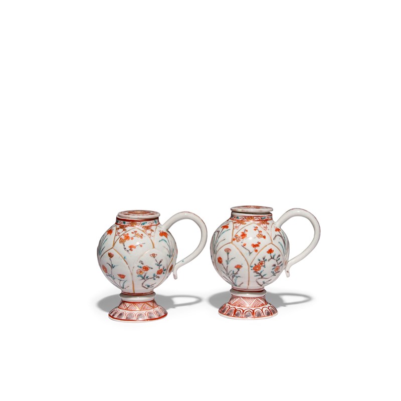 See J Ayers, O Impey, JVG Mallet, Porcelain for Palaces, The Fashion for Japan in Europe 1650-1750, p.206, no.202, for a comparable mustard pot. The authors explain that in both moulding and colouring these pieces are inspired by, or ancestral to Chinese famille verte wares of the Kangxi period. Also, see C Jörg, Fine & Curious, Japanese Export Porcelain in Dutch Collections, p.190, no.238, for a miniature example in the Groninger Museum, Groningen.