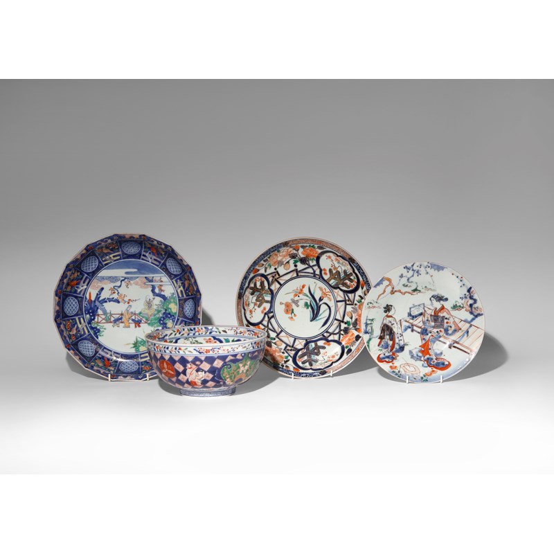 Comprising of three dishes and a large bowl, all typically decorated in underglaze blue, gilt, red, green and yellow enamels, variously painted with figures, flowers and brocade patterns, the largest plate with sixteen sides and with Chinese figures to the well, the characters fu, ki, cho, shun (riches, prosperity and eternal spring) inscribed underneath, 32.2cm max. (5)
