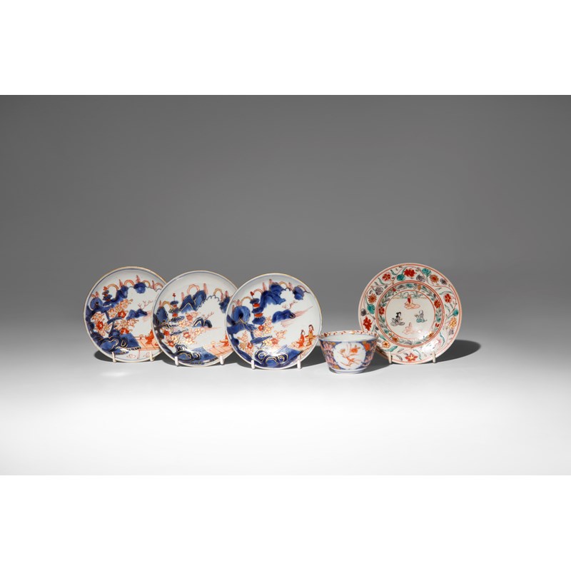 Comprising: three Chinese Imari saucers and a tea cup, decorated in underglaze blue, gilt, and red with flowers, figures and pagodas; together with a Japanese saucer painted in gilt, red, green, purple, and black enamels with figures in an interior and further bands of flowers and scrolling tendrils, the underside left undecorated, 12.8cm max. (5)