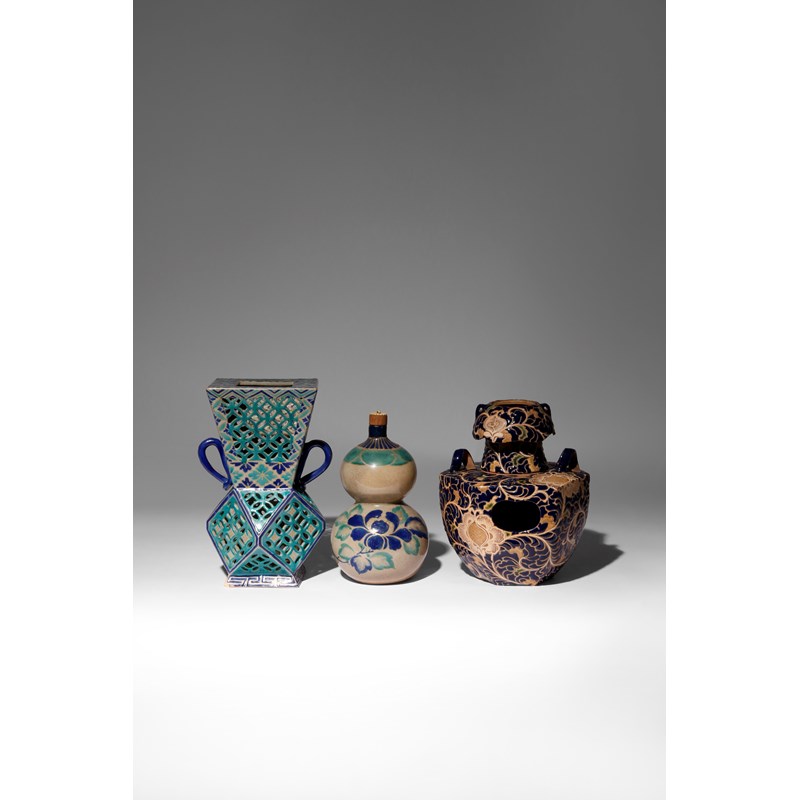 All three typically decorated in thick blue and green enamels, the first a reticulated Ko-Kiyomizu type vase with a faceted body and a square-section neck, the sides decorated with cash designs and hanabishi mon family crests; another a clove boiler in two parts, painted with a dense pattern of stylised hibiscus flowers and scrolling tendrils, and with fan-shaped apertures; the third piece a double-gourd sake bottle, a large spray of peony to the side, the cork embellished with a chrysanthemum flower carved out of stag antler, 24.5cm max. (5)