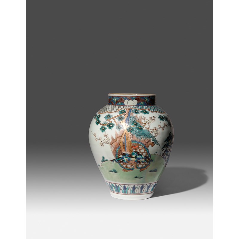 Of baluster shape, decorated in bright coloured enamels and gilt with an Immortal riding a crane to one side, the reverse with a large minogame carrying pine, bamboo and prunus on its carapace; a band of palmettes above the foot, brocade patterns to the shoulder and flowerheads to the neck, 32.3cm.