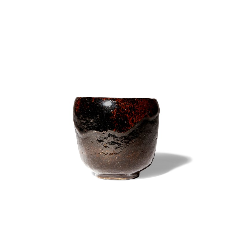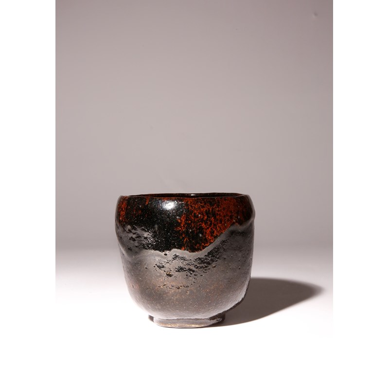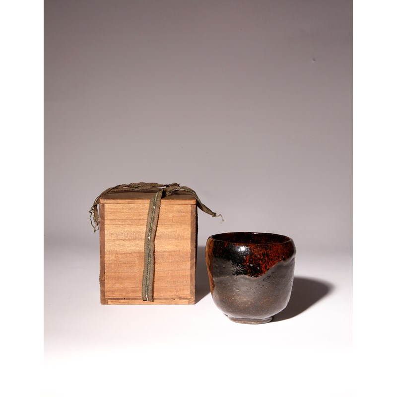 The tall U-shaped body raised on a short foot, the surface with a lustrous black glaze with mottled russet textures, the footrim incised with four lines, together with a tomobako wood box, 10cm. (2)