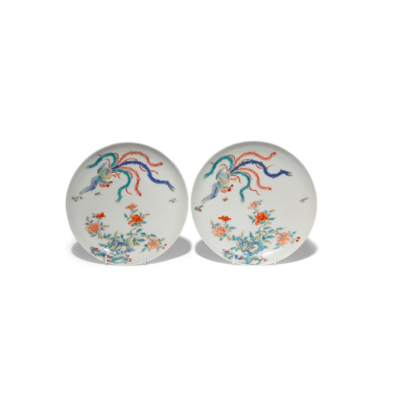 Both decorated in polychrome enamels and painted to the well with a large ho-o in flight, the majestic bird depicted with long trailing feathers above flowering peonies issuing from rockwork, both signed Imaemon underneath, probably for Imaizumi Imaemon XII (1897-1975), both 21.6cm. (2)
