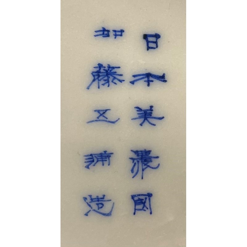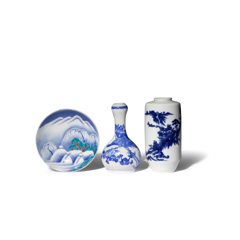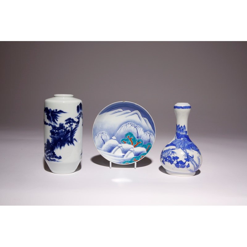 The tallest vase of cylindrical shape and painted with a mountainous river landscape, a seal mark underneath; the other a garlic-mouth bottle vase with crabs amongst lotus and ginkgo leaves, the base signed; together with a small Nabeshima dish painted with thatched buildings before mountains in underglaze blue, with trees depicted in red and green enamels behind, three sprays of stylised hibiscus underneath and raised on a short foot with comb design, 17cm max. (3)