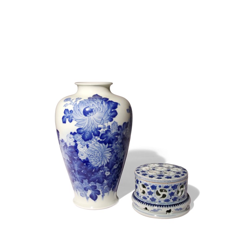 One a tall baluster vase decorated with many chrysanthemum, peonies and other flowers in underglaze blue, the base with the orchid mark of the Fukagawa Koransha company; the other a circular koro, the incense burner with mitsu tomoe swirls apertures and with flowers on a cracked ice ground, the lower section with many bats in flight, 30.5cm and 10cm respectively. (3)