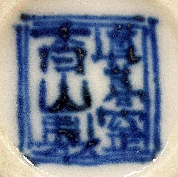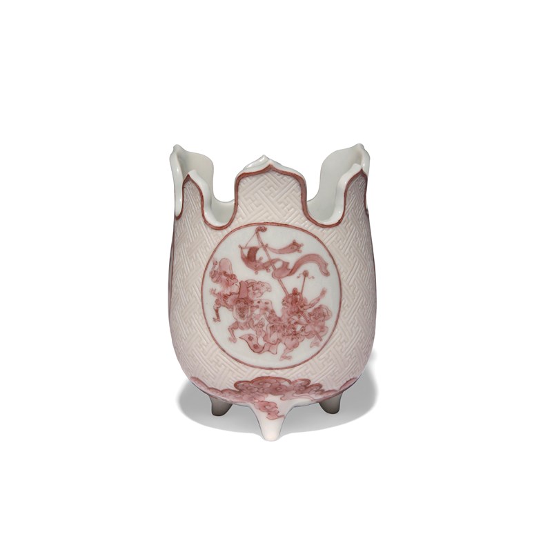 The bulbous body raised on three slightly everted feet, the crenellated rim elegantly shaped with lappets, painted in monochrome puce with three medallions to the side and a band of scrolling clouds below, the circular panels enclosing scenes of many yokai, the oni and other monsters depicted holding banners, weapons and other implements whilst running haphazardly, on a moulded sayagata (key fret) ground, the base inscribed Makuzu gama Kozan sei, 11.7cm.