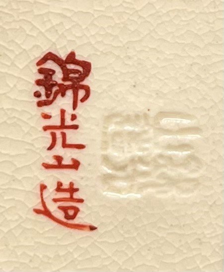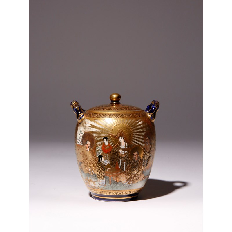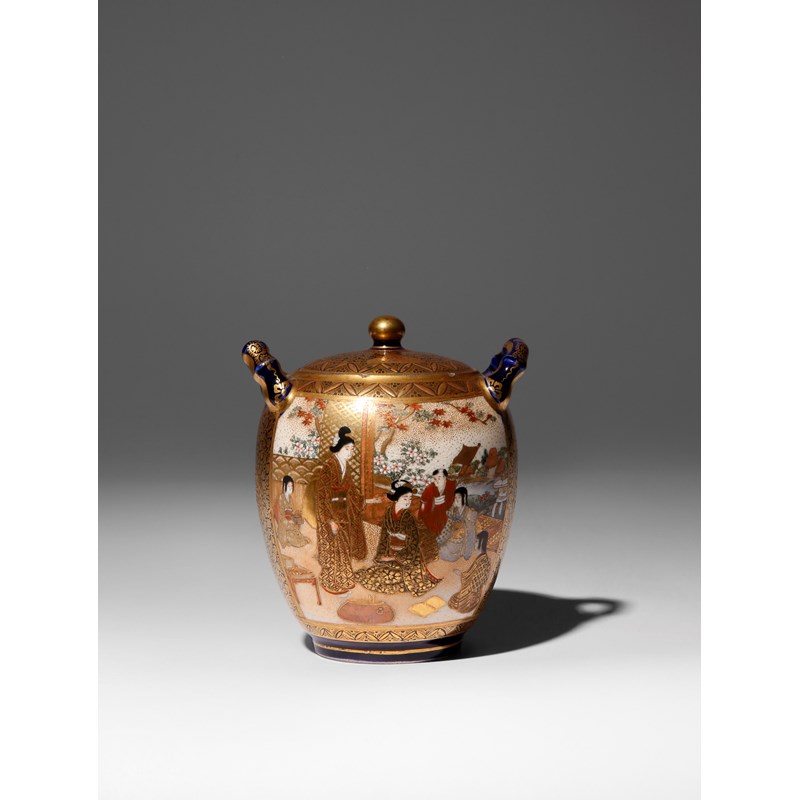 The bulbous body decorated with two large panels enclosing Immortals and attendants to one side and beauties and children to the other, all reserved on a bright navy-blue ground painted with a dense pattern of scrolling tendrils and flowerheads; with bamboo-shaped handles decorated with gilt karakusa scrolls and hanabishi mon, the lid with similar decoration, inscribed to the base and with an impressed seal mark, both reading Kinkozan zo, 12.3cm. (2)