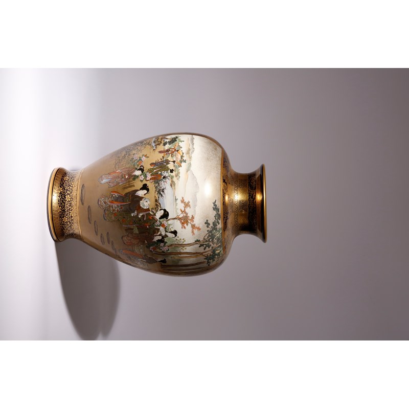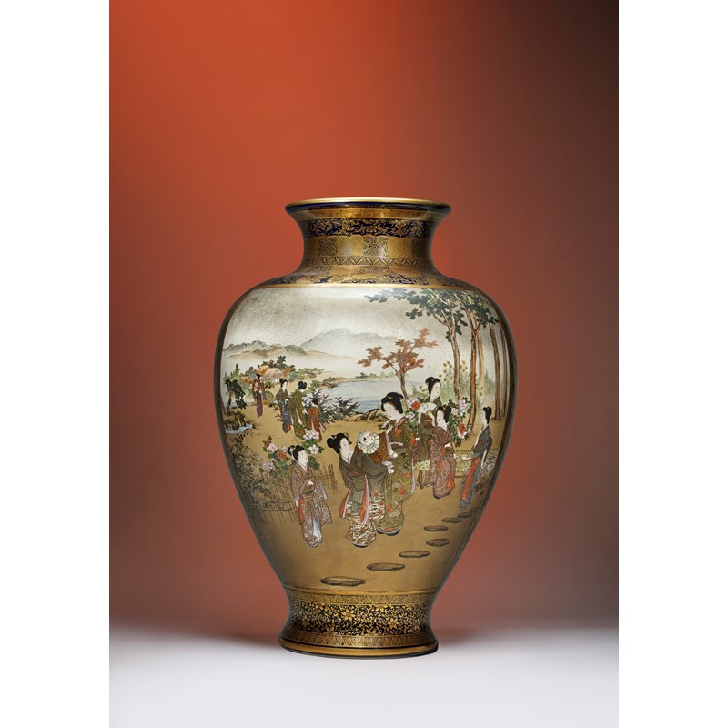 The baluster body raised on a short flared foot, delicately painted in polychrome enamels and gilt with two large rectangular panels, one side with beauties and children in a mountainous river landscape, the figures wearing ornate garments and one holding an open fan inscribed Kyoto Kaizan; the reverse with many armour-clad warriors, one standing upright on a veranda and two others bowing before him; all reserved on a dark navy-blue ground embellished with complex brocade patterns, mon (family crests), stiff leaves, key fret, flowerheads and other formal designs, signed in a rectangular cartouche underneath Kaizan sei under the Shimazu mon, 45.5cm.