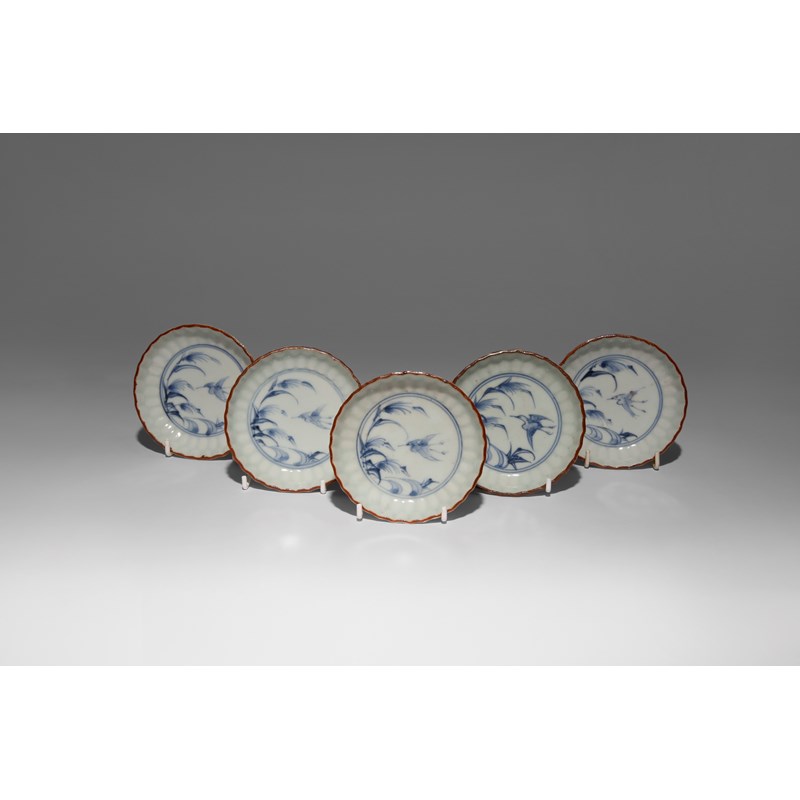 Moulded with two rows of petals to the cavetto, each decorated to the well with a medallion enclosing a crane in flight above tall grasses, each with a brown-edged rim and the underside left undecorated, all approx. 10.5cm. (5)