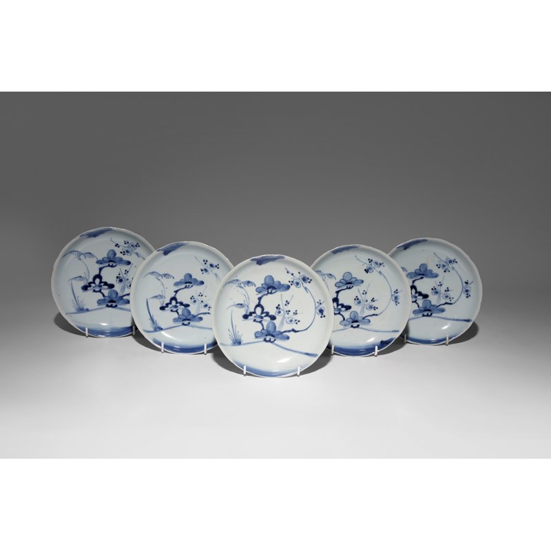 All decorated in underglaze blue with the same auspicious design of the shochikubai (bamboo, prunus and pine), all approx. 18.3cm. (5)