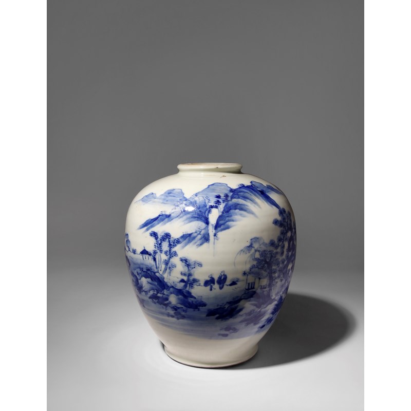 The bulbous body decorated in underglaze blue with a continuous river landscape, with mountains in the distance and small buildings nestled amongst the trees, two figures standing before a hut and with sampans and sailboats to the side, 26cm.