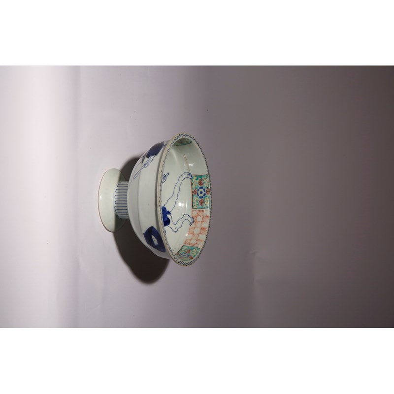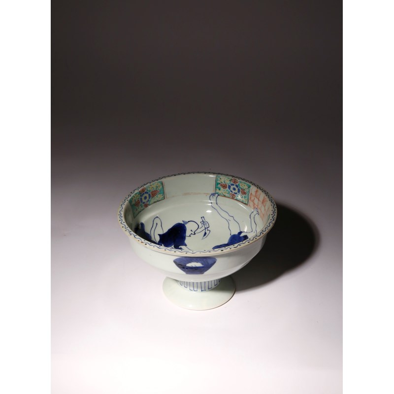 The deep bowl raised on a tall foot, painted in underglaze blue and coloured enamels with two men chasing a gigantic rat on the inside, one hunter riding the rodent backwards and holding a knife whilst the other tries to cling onto its tail; the exterior with another man carrying a blade and running after two other giant rats, 13.5cm.