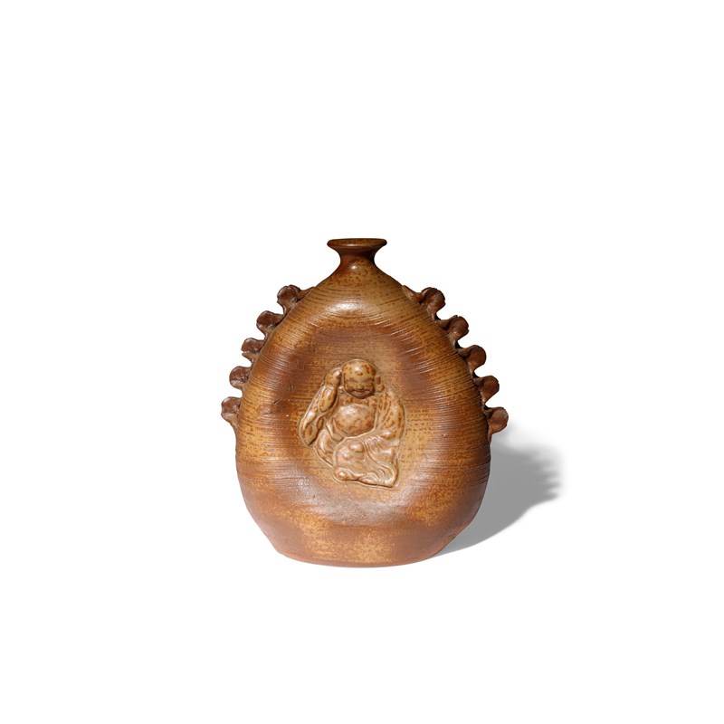 The bulbous body with a flattened side featuring a depiction of Hotei, the God of Good Fortune in low relief; with two crimped bands running down the sides, 23.7cm.