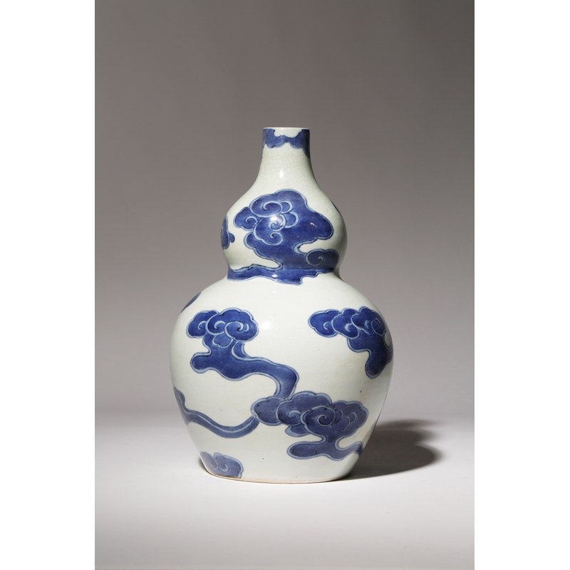 Shaped as a double gourd, the body decorated with a continuous design of scrolling clouds and wisps of mist on a creamy-white ground, 26cm.