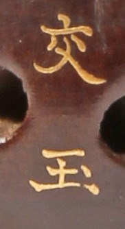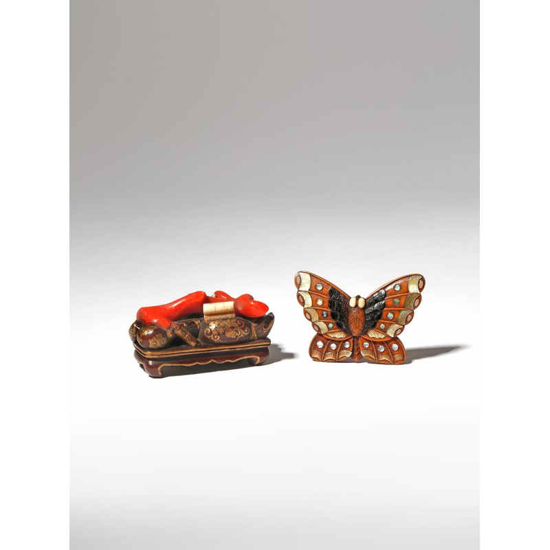 One depicting a butterfly, the wings with details picked out in lacquer and inlaid with mother of pearl and ivory in Shibayama style, the other of a low table laden with treasures including Daikoku's mallet, with details in gilt, lacquer and ivory, a large branch of coral in the centre, signed Kogyoku underneath, 5.3cm and 5.4cm respectively. (2)
