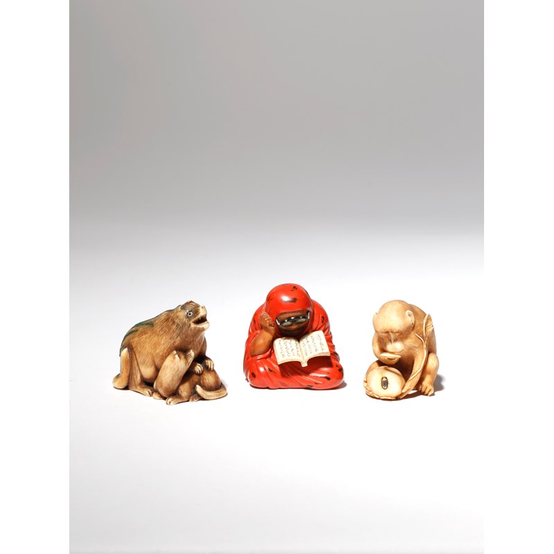 The first in lacquered wood and ivory and carved as Daruma, the Father of Zen Buddhism with spectacles and absorbed in the book opened before him; the second of a monkey examining a beetle on a persimmon with a magnifying glass, in ivory and with the insect inlaid, signed Shomin / Masatami in a rectangular reserve underneath; the third of a large tanuki with its young, with long grasses inlaid in stained ivory and horn to the back, signed Togyoku, 5cm max. (3)