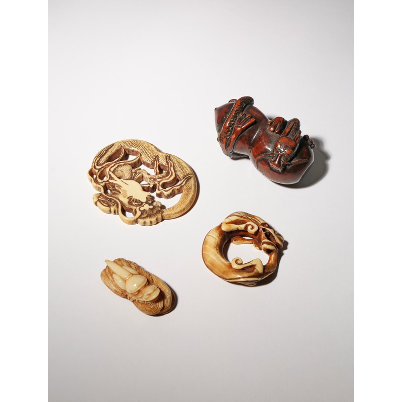 Two in ivory, the first of flattened form and depicted fast asleep, holding a pearl of wisdom between its claws, signed Baikioku to the reverse; the second in Asakusa School style, its body forming a ring and with a loose ball in its mouth, signed Masakazu with kakihan; the third in wood, the beast depicted coiling around a large double gourd; and the last in marine ivory, the body of the dragon tightly interwoven, 7.3cm max. (4)