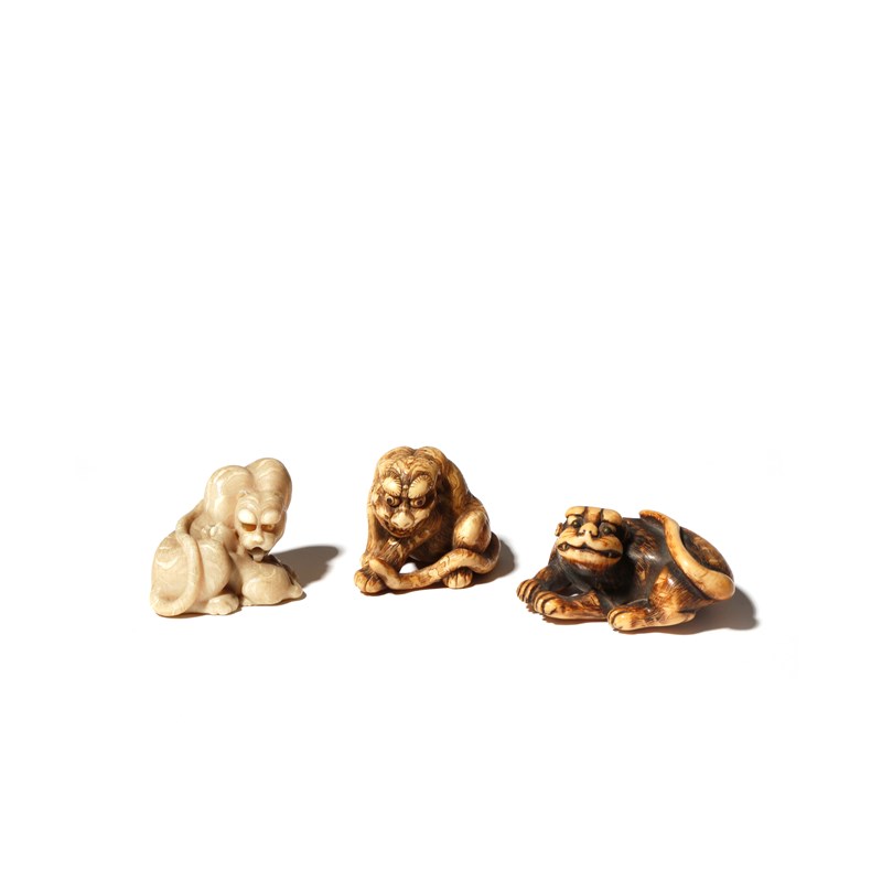 λ THREE JAPANESE IVORY NETSUKE OF TIGERS