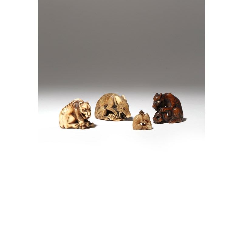 Two netsuke in ivory, one carved as a large wolf devouring the leg of a spotted deer, the fur realistically carved and with the eyes inlaid in horn, signed Okatomo in a rectangular reserve underneath; the other of a tiger, one paw holding a crab before it; the third in wood and depicting another emaciated wolf holding a skull between its front paws; together with a small ivory ojime in the shape of another wolf and skull, 5.2cm max. (4)