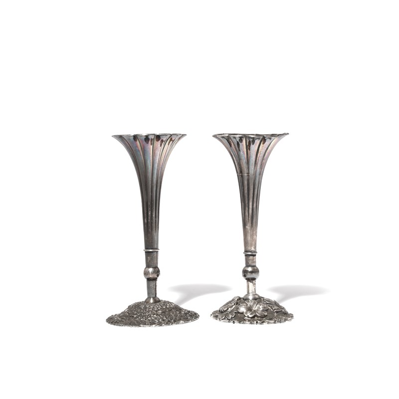 Both with a tall fluted body raised on a large circular base, one decorated with chrysanthemum flowerheads, the other with prunus blossoms, both marked Konoike zo for Konoike of Yohama, and jungin (pure silver), 13.5cm. (2)