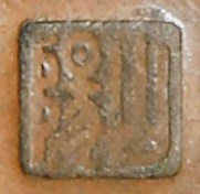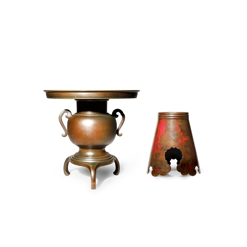 The largest in two parts, the bulbous body with a tall circular neck and applied with scroll handles, raised on three elegantly curved feet, with a removable circular tray wedged at the top signed with a two character mark, the other with a tall flared body and the surface mottled with brown and red splashes, raised on cloud-shaped feet, 38cm and 21.5cm respectively. (3)