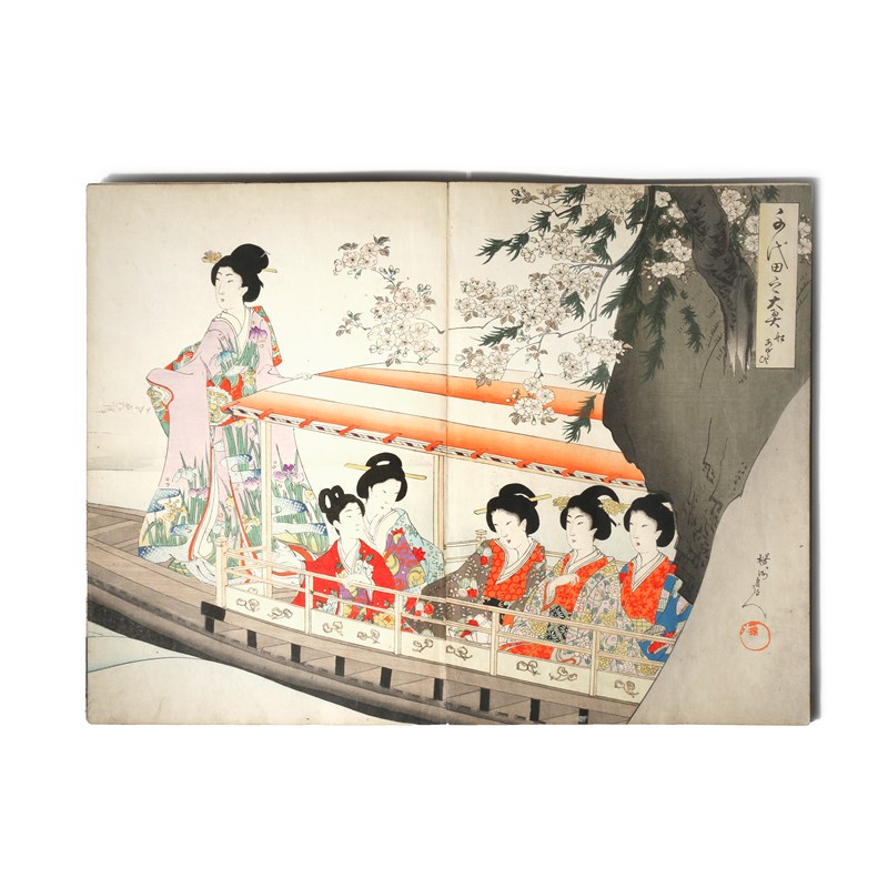 Entitled Chiyoda Castle / Album of Women and including both diptychs and triptychs, the prints depicting beauties in various settings and scenes of life at court, most signed Toyo Chikanobu, the album 35.2cm x 23.5cm.
