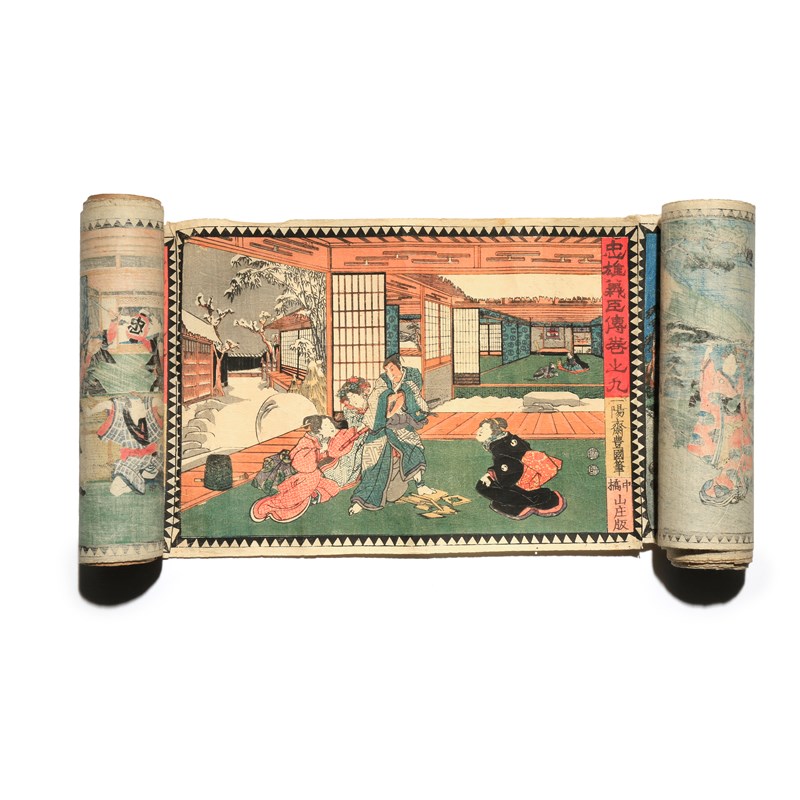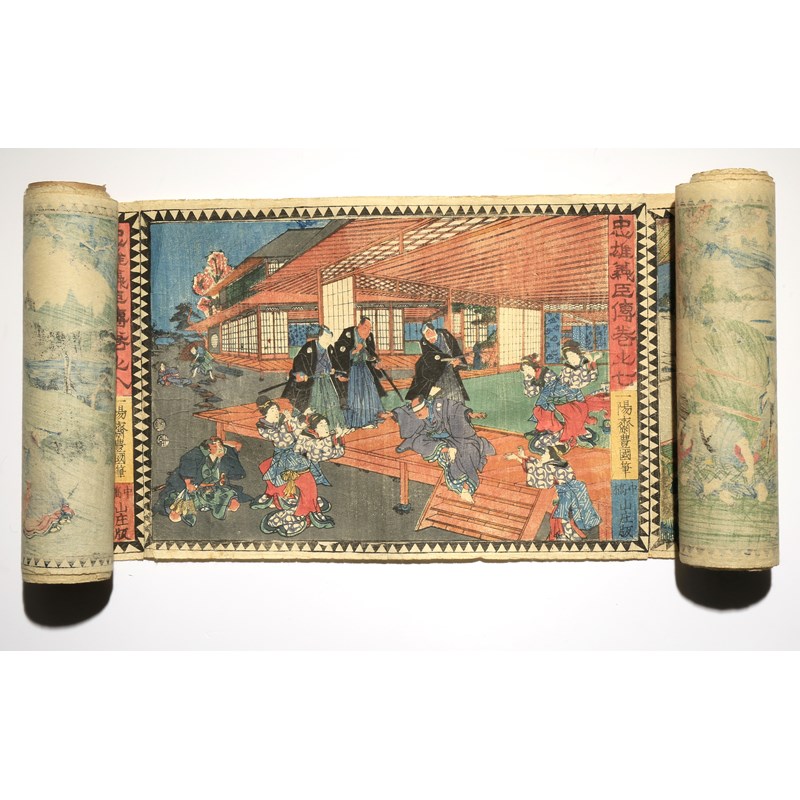 Depicting the twelve acts from the kabuki play Chushingura (The Treasury of Loyal Retainers) by Toyokuni III (1786-1865), each picture 31cm x 22cm, aprrox. 345cm x 22cm overall.