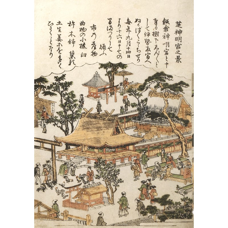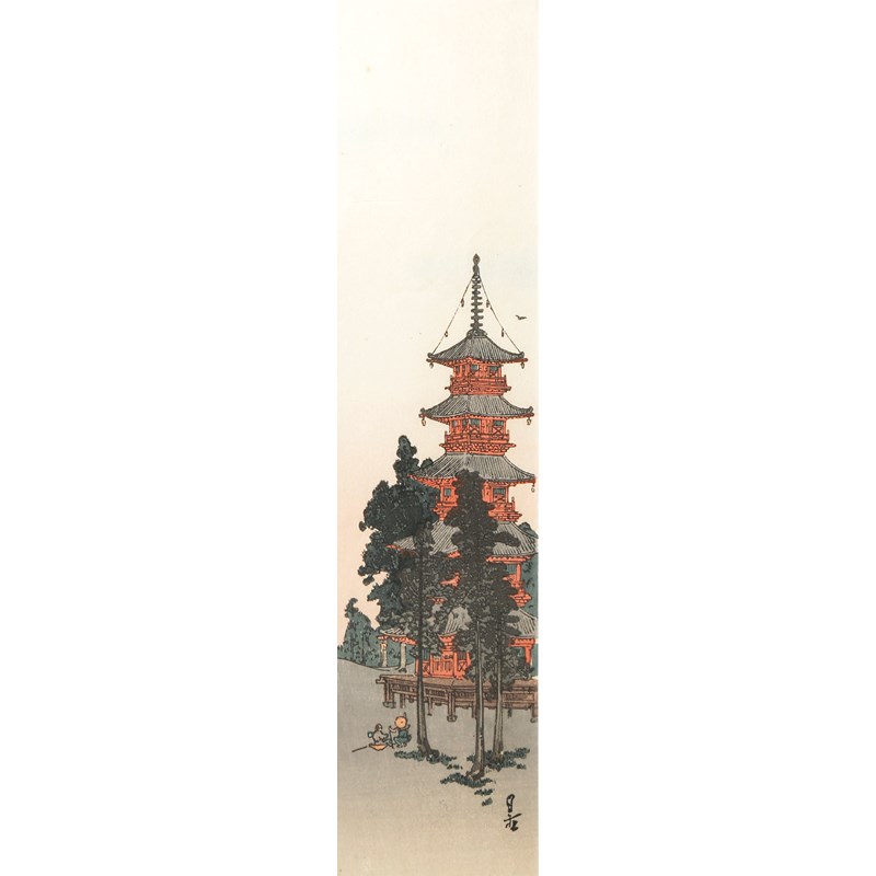 One by Gesso Yoshimoto (1881-1936) depicting a five-storey pagoda, 32.5cm x 7.5cm, the other a bird's eye view of Shiba Shinmei shrine by Kitao Shigemasa (1739-1820), from an untitled series of famous places in Edo, both in modern frames and glazed, 22.5cm x 15.5cm. (2)