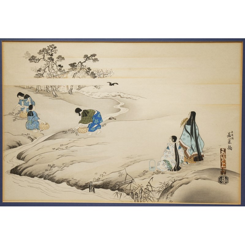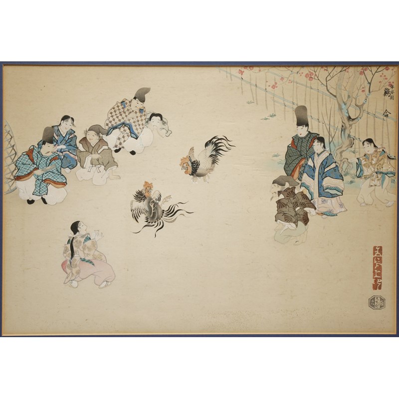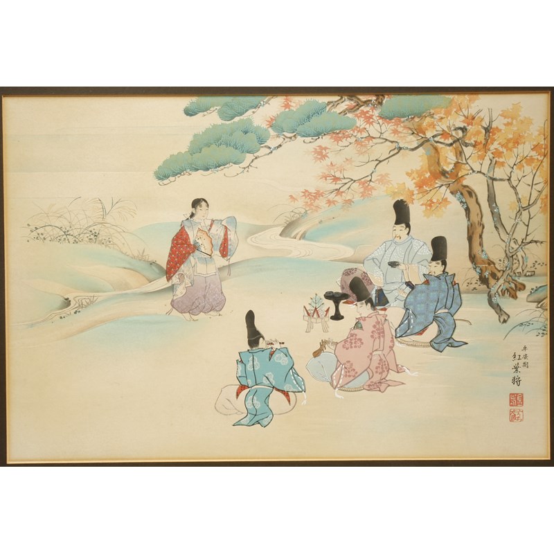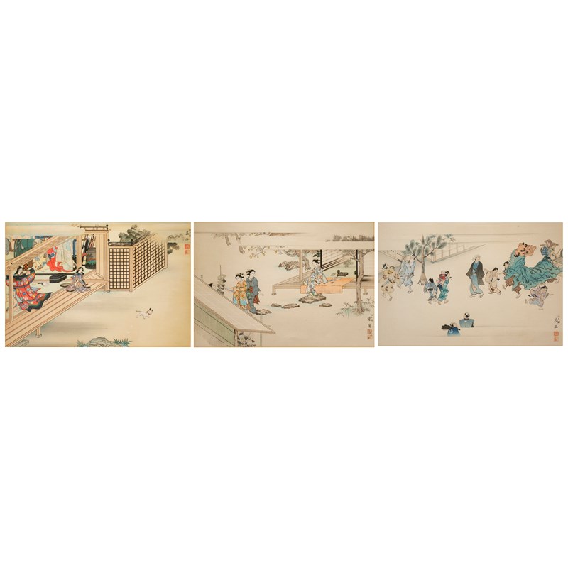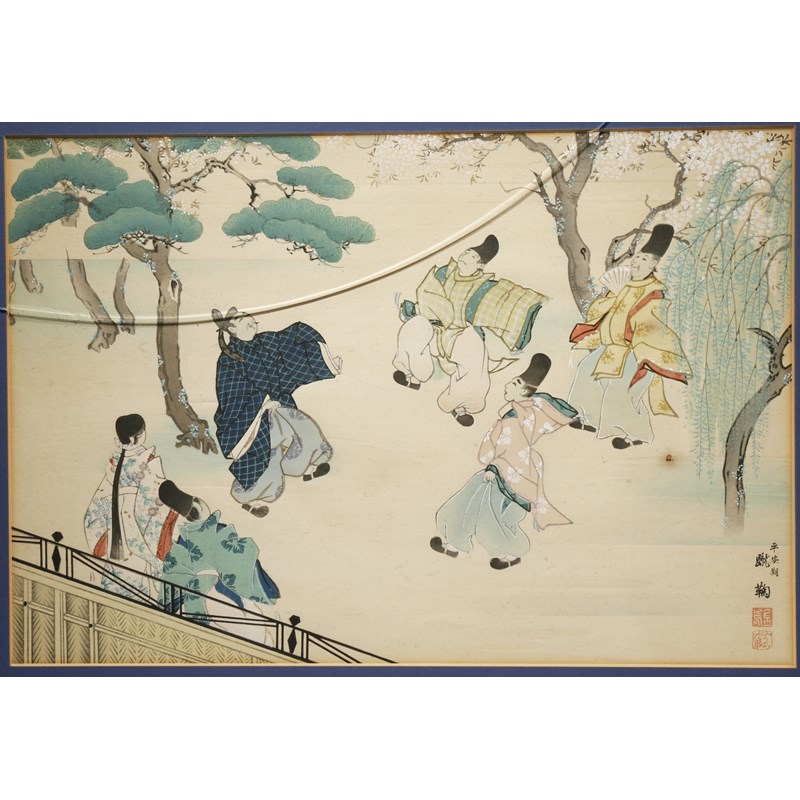 Depicting scenes symbolizing the twelve months of the year: New Year's day in January; gathering young herbs in February; cock fighting in March; a game of football in April; Boys' Day in May; a race in June; a court lady offering flowers to a temple in July; airing the house in August; the chrysanthemum festival in September; waiting for the full moon in October; maple viewing in November and hunting hawks in December; all in modern frames and glazed, 25cm x 36.5cm each. (12)