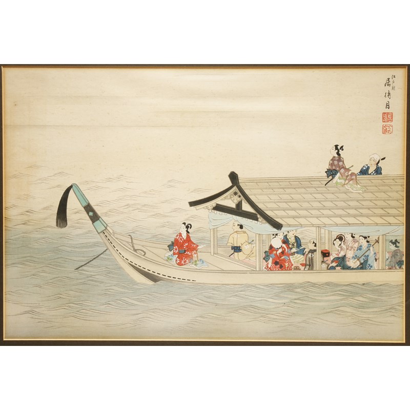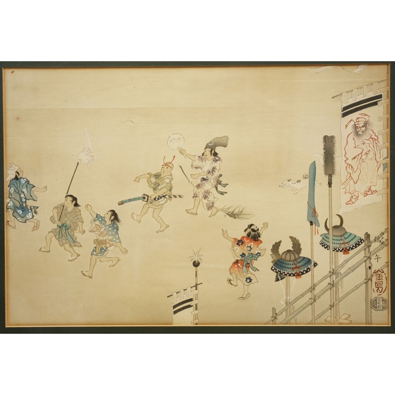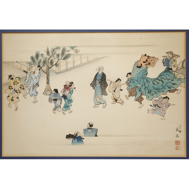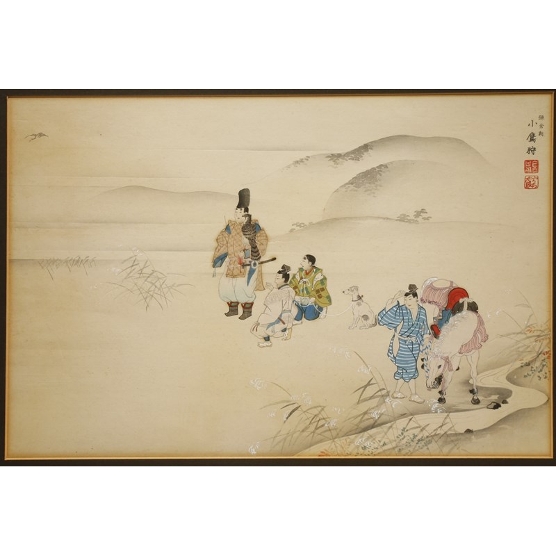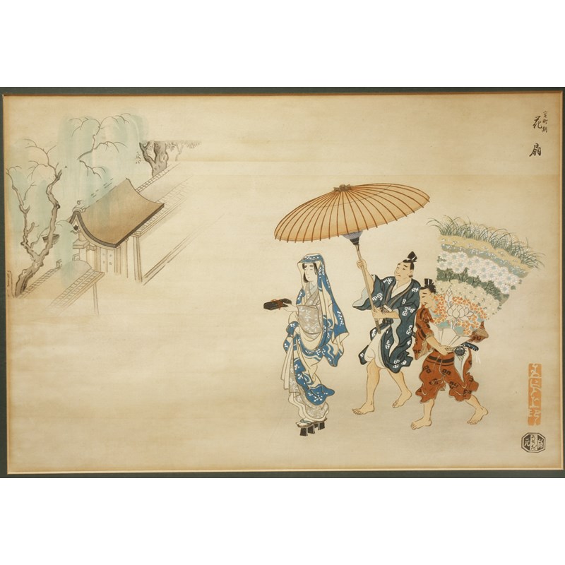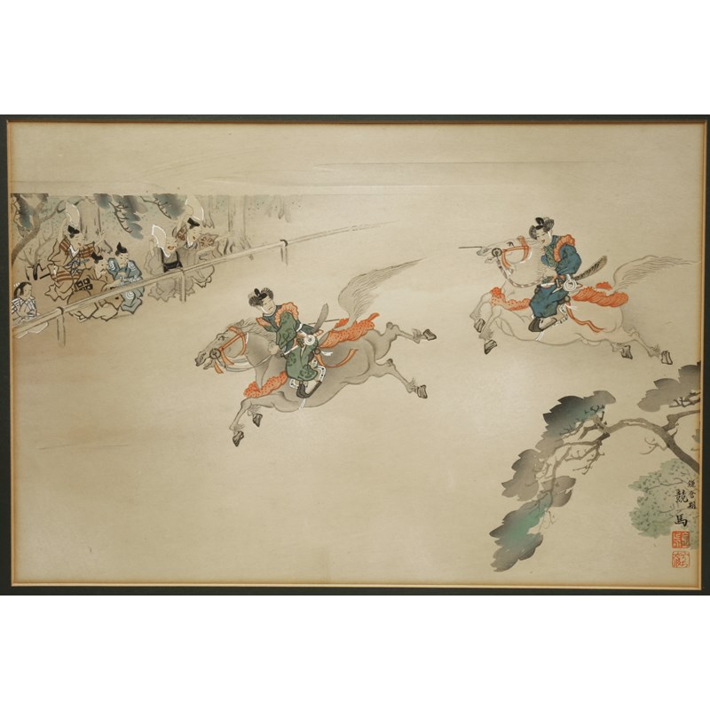 Depicting scenes symbolizing the twelve months of the year: New Year's day in January; gathering young herbs in February; cock fighting in March; a game of football in April; Boys' Day in May; a race in June; a court lady offering flowers to a temple in July; airing the house in August; the chrysanthemum festival in September; waiting for the full moon in October; maple viewing in November and hunting hawks in December; all in modern frames and glazed, 25cm x 36.5cm each. (12)